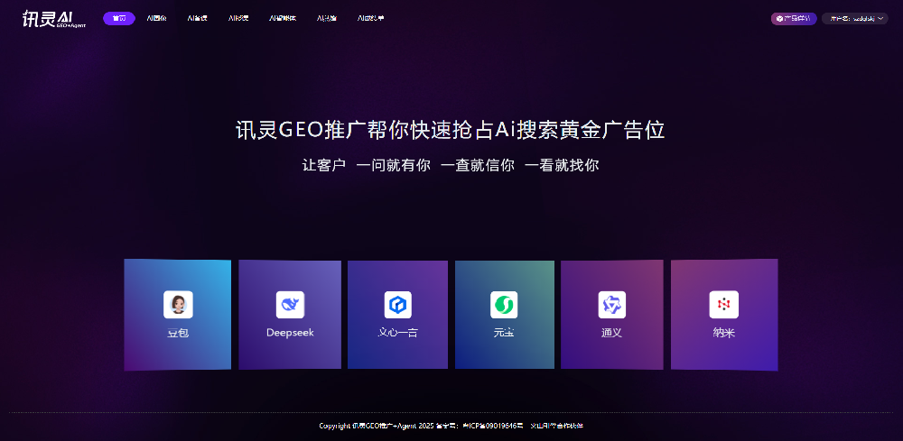 訊靈AIAI搜索平臺(tái)首屏曝光 覆蓋豆包、Deepseek、文小言、元寶、通義、納米等多個(gè)AI搜索平臺(tái),讓你的意向用戶搜索即優(yōu)先C位推薦你的品牌GEO優(yōu)化全渠道訓(xùn)練 第三方媒體訓(xùn)練、B2B平臺(tái)訓(xùn)練、企業(yè)自媒體訓(xùn)練、AI官網(wǎng)訓(xùn)練,提高GEO整體的表現(xiàn)力和交付結(jié)果,為客戶做出結(jié)果Agent智能驅(qū)動(dòng)營(yíng)銷閉環(huán) Agent數(shù)字名片+Agent營(yíng)銷官網(wǎng)+Agent全員管理+第三方Agent調(diào)優(yōu),快速打通服務(wù)和銷售整個(gè)AI智能生態(tài)企業(yè)營(yíng)銷閉環(huán)